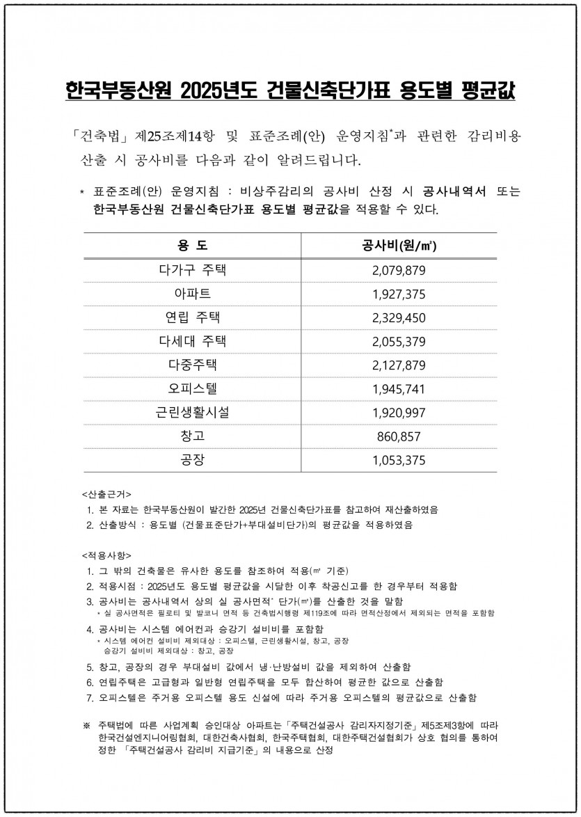 한국부동산원 2025년도 건물신축단가표 용도별 평균값